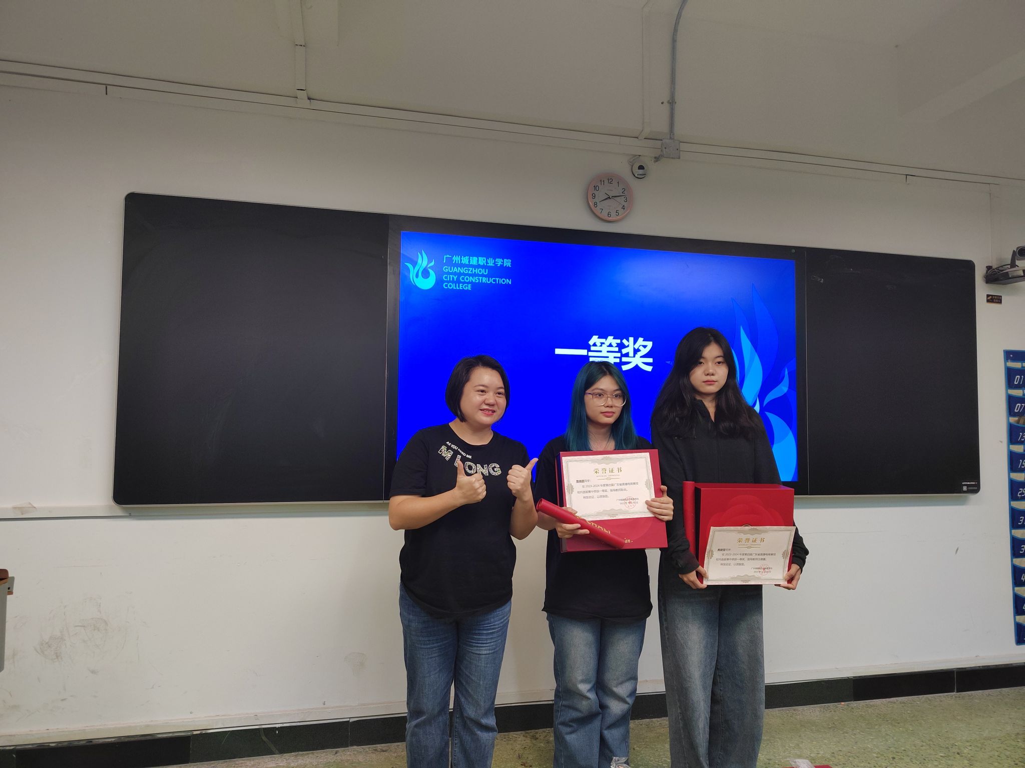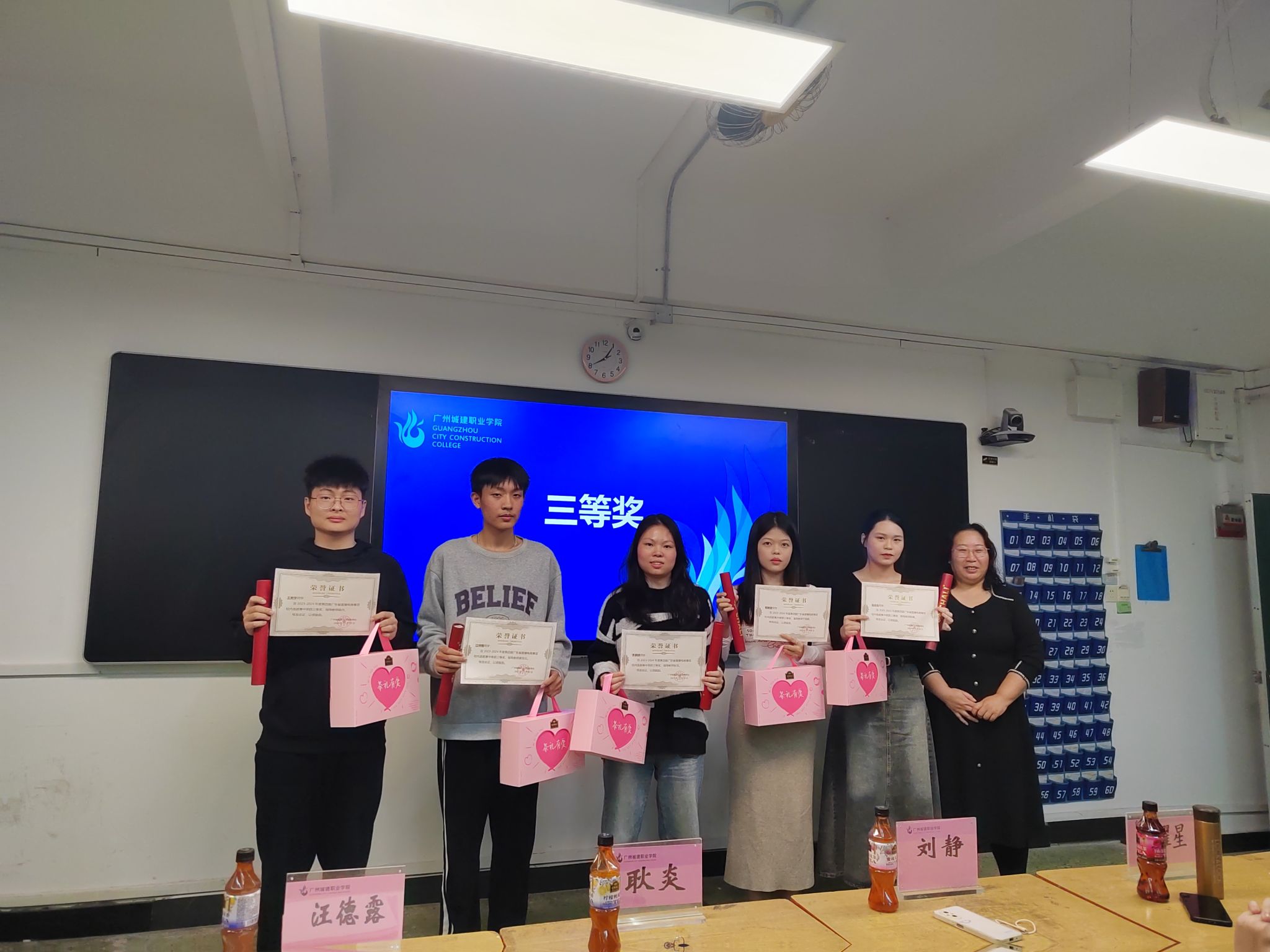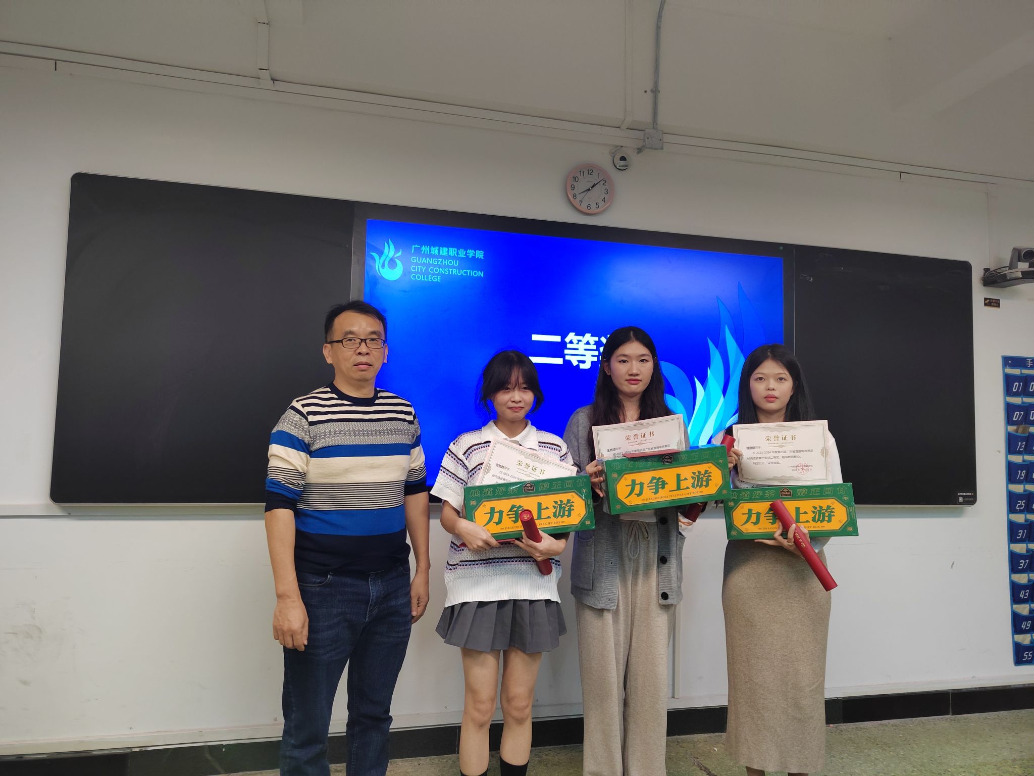 刘静在讲话中向获奖同学表示祝贺,勉励大家在直播行业多钻研、多练习,向行业优秀学习,努力成为优秀人才;并为获一等奖团队颁发证书及奖品。张耀星为获得二等奖的团队颁发证书及奖品,耿炎及钟连品颁发其他奖项。