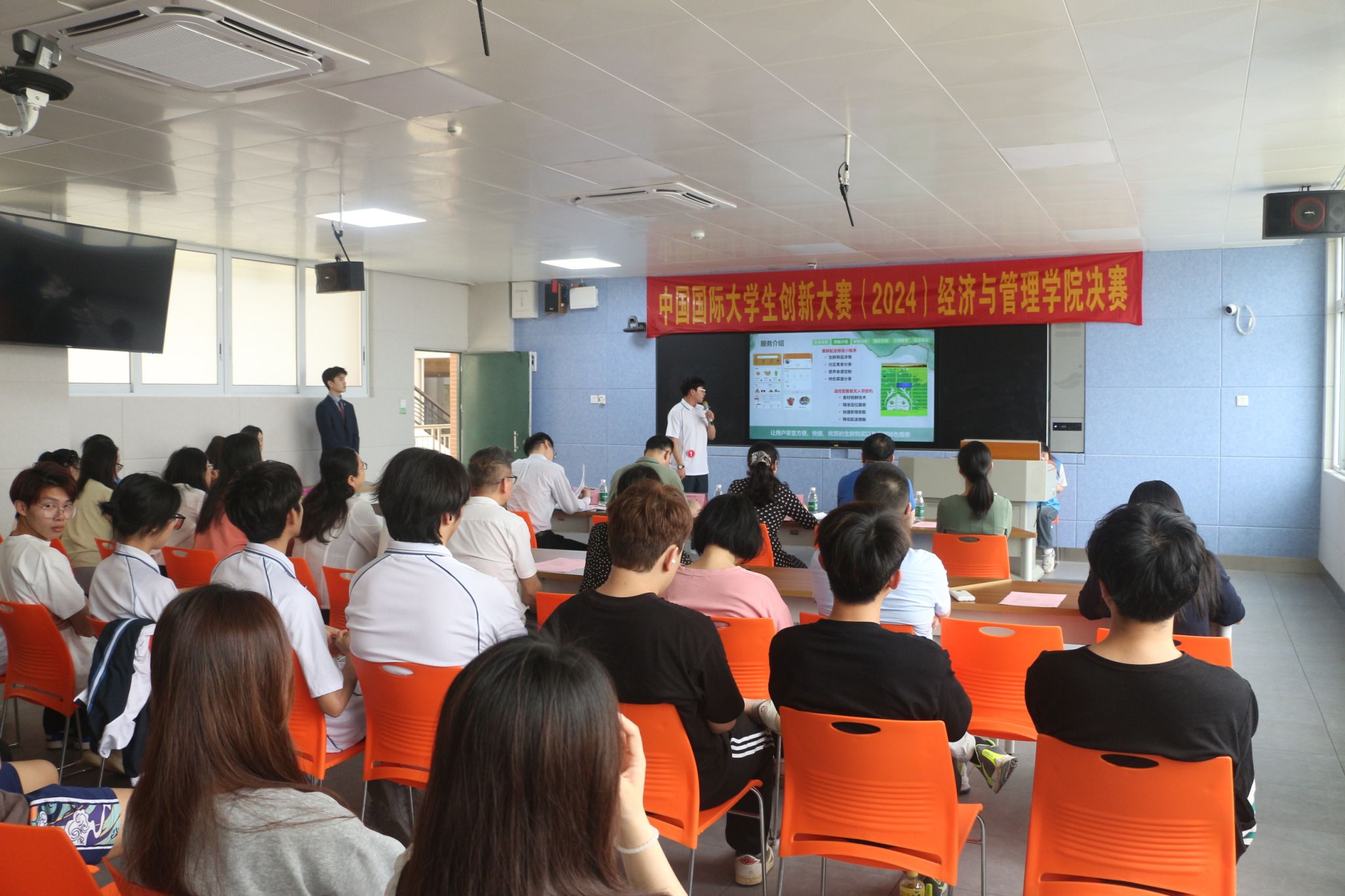 决赛中,各团队汇报人分别从产品概况、客户定位、市场环境、商业模式等多方面介绍项目,评委老师从产品优势、产品分析、专利转化等多方面提问,各团队沉着应答,展现出扎实的专业素养和良好的精神风貌。参赛项目覆盖了多个领域,包括食材智能配送新模式、新生态智能环保、少儿编程以及助农电商服务等。
