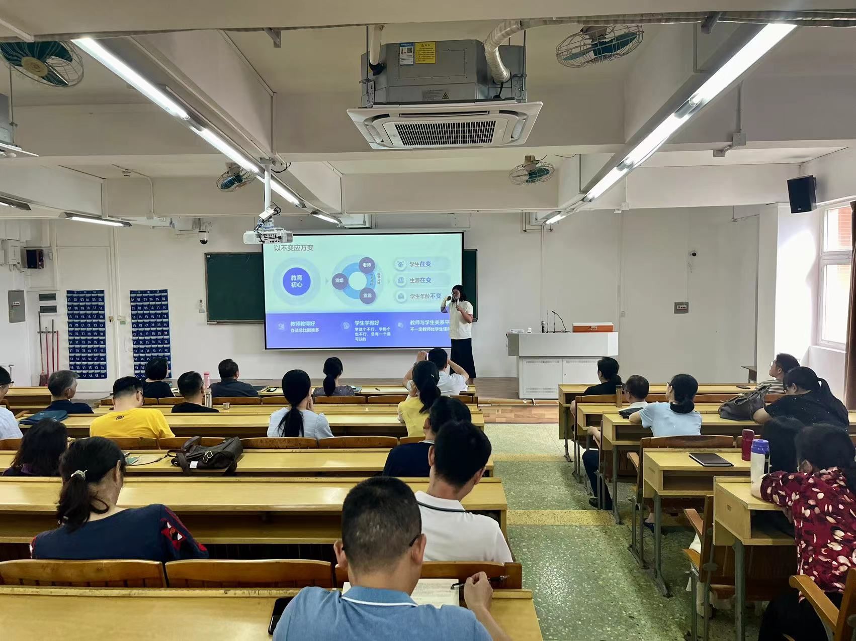 尹峰老师以《优化课堂设计,展现课堂魅力》为主题开展分享,从课堂设计、教学内容与形式、教学技巧三个方面阐述了自己的思考,他表示教师需要把握每一节的课堂结构、要吃透教材和员工,要善于提出带有启发性的思考问题,并从课堂时间分配、内容安排、角色定位、语言表述等方面详细讲解。